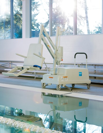 A free-standing pool lift that is sleek and modern design with an attractive matte finish. Standard features include the LiftOperator Intelligent Control (mounted on the mast), a 24-volt rechargeable battery, waterproof hand control, armrests, footrest and seatbelt assembly.
